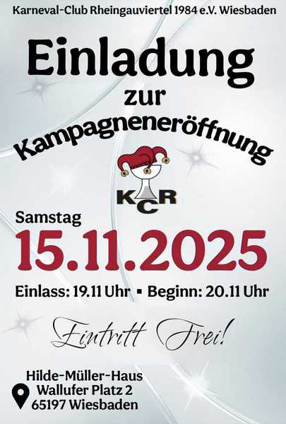 16.11.2019 - Unter dem Motto „Der KCR - wir sagen's ganz ehrlich - ist für die Fasnacht unentbehrlich!" eröffnet der Karneval-Club Rheingauviertel 1984 e.V. Wiesbaden die Kampagne 2019/2020 im Hilde-Müller-Haus in Wiesbaden.